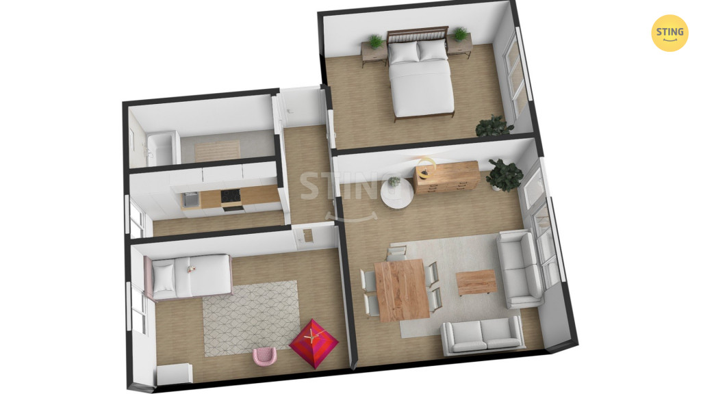 samostatnou kuchyň, dvě ložnice, koupelnu s WC.