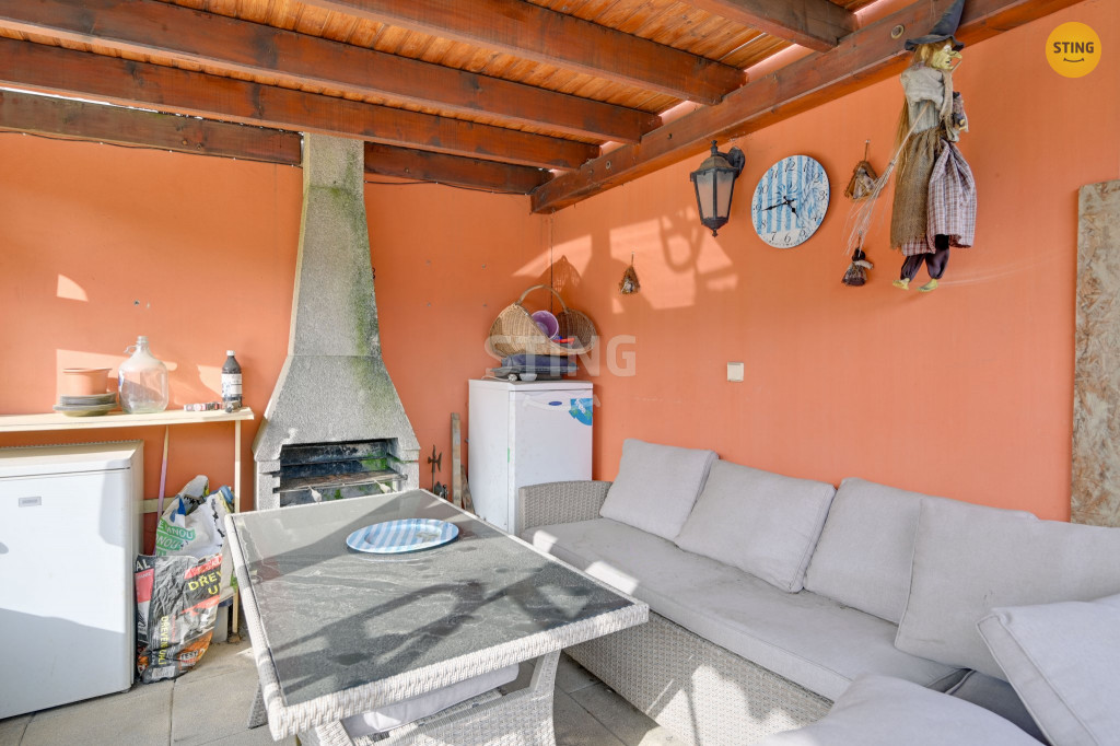 Za domem se rozprostírá příjemná terasa s krbem – ideální místo pro
