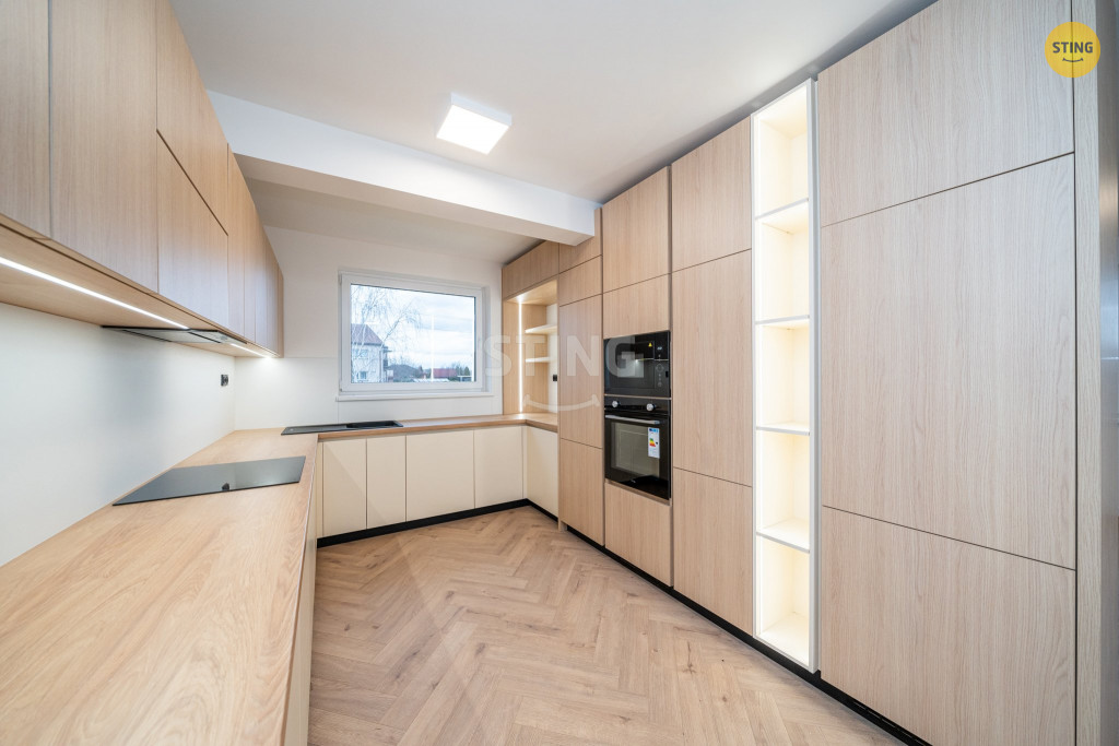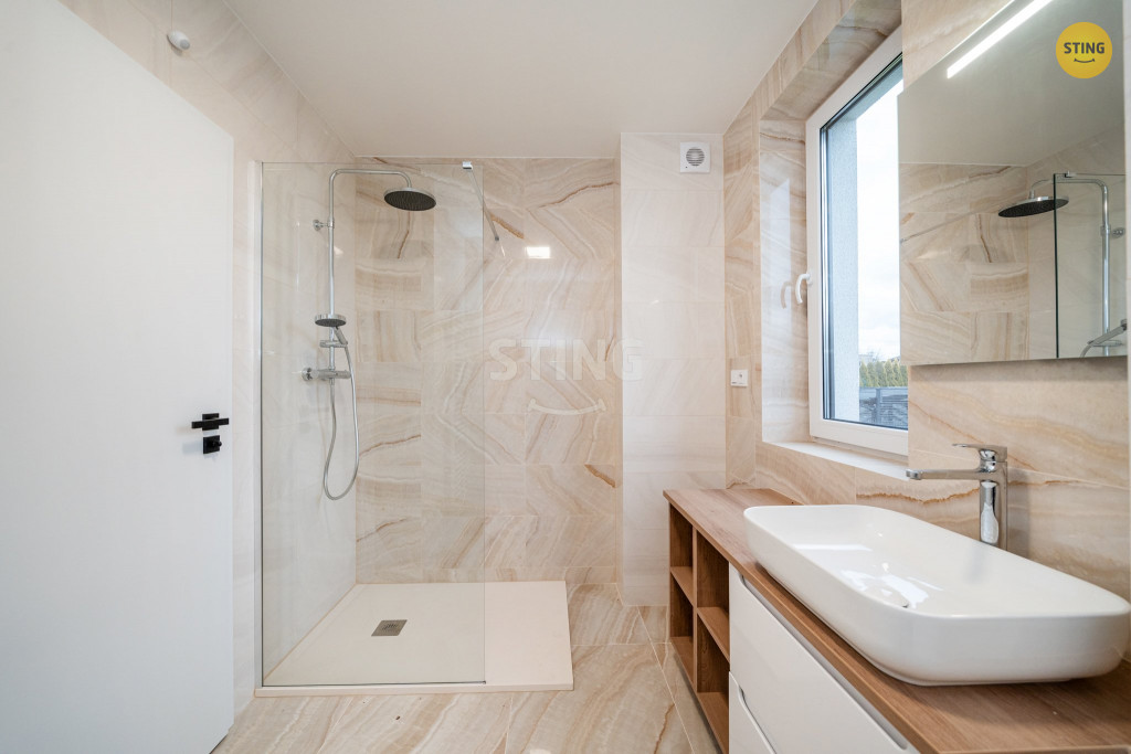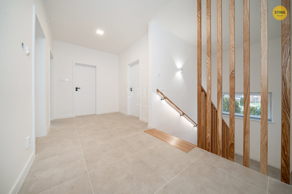 340 m?. Interiér je řešen v teplých a nadčasových tónech. Laminátové