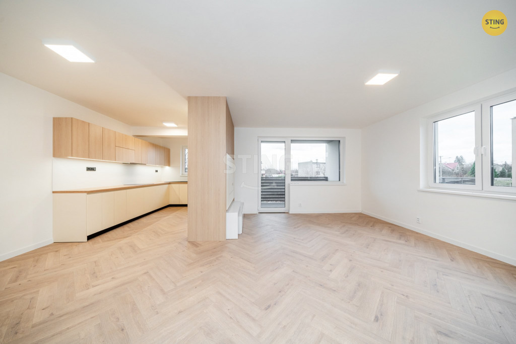 Srdcem domu je světlý obývací pokoj s kuchyňským koutem – ideální