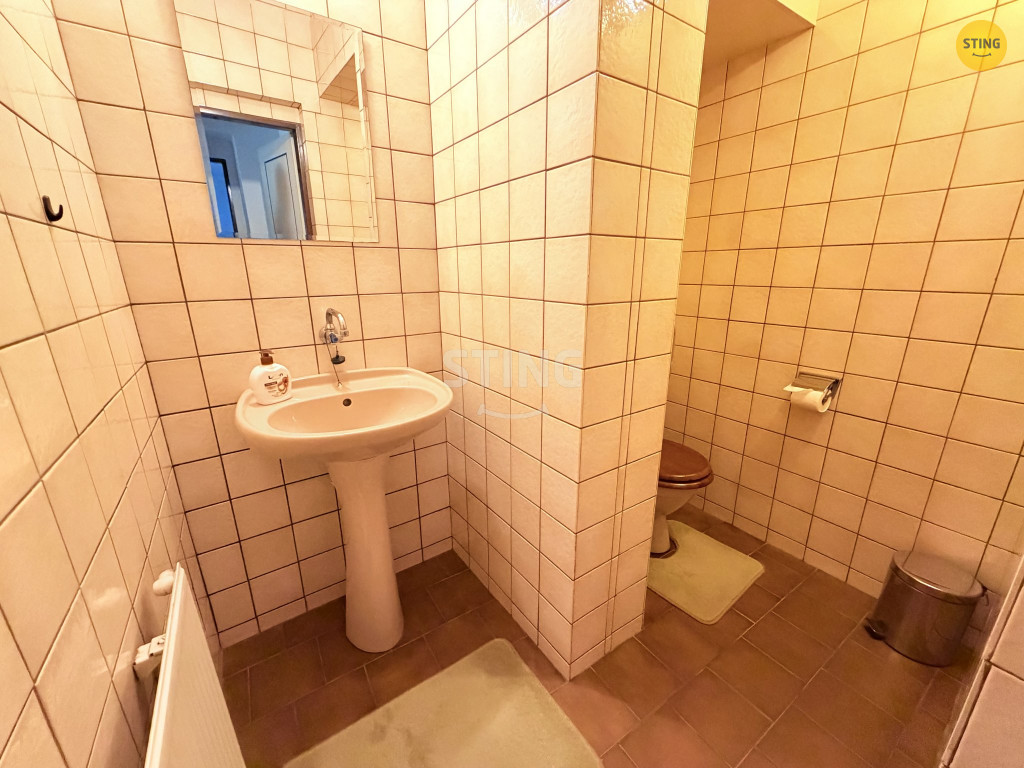 WC s umyvadlem, obývací pokoj se vstupem na terasu a na zahradu. V prvním