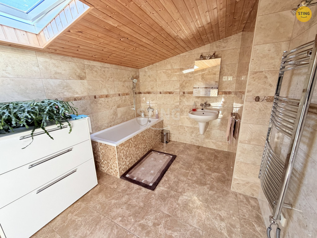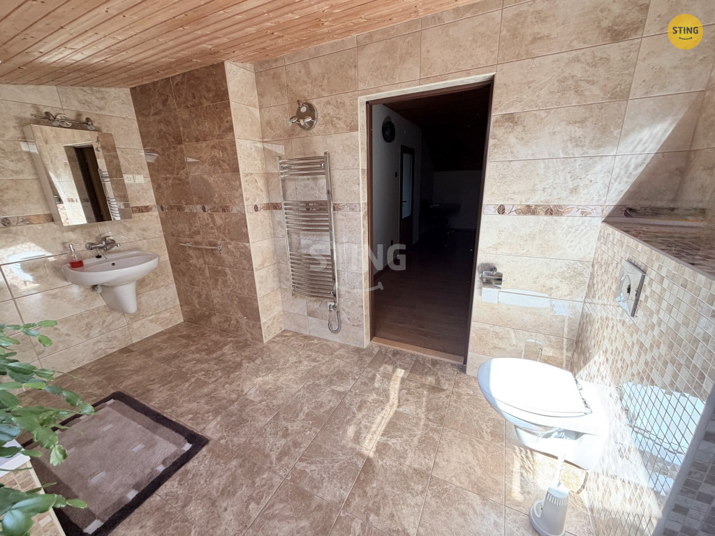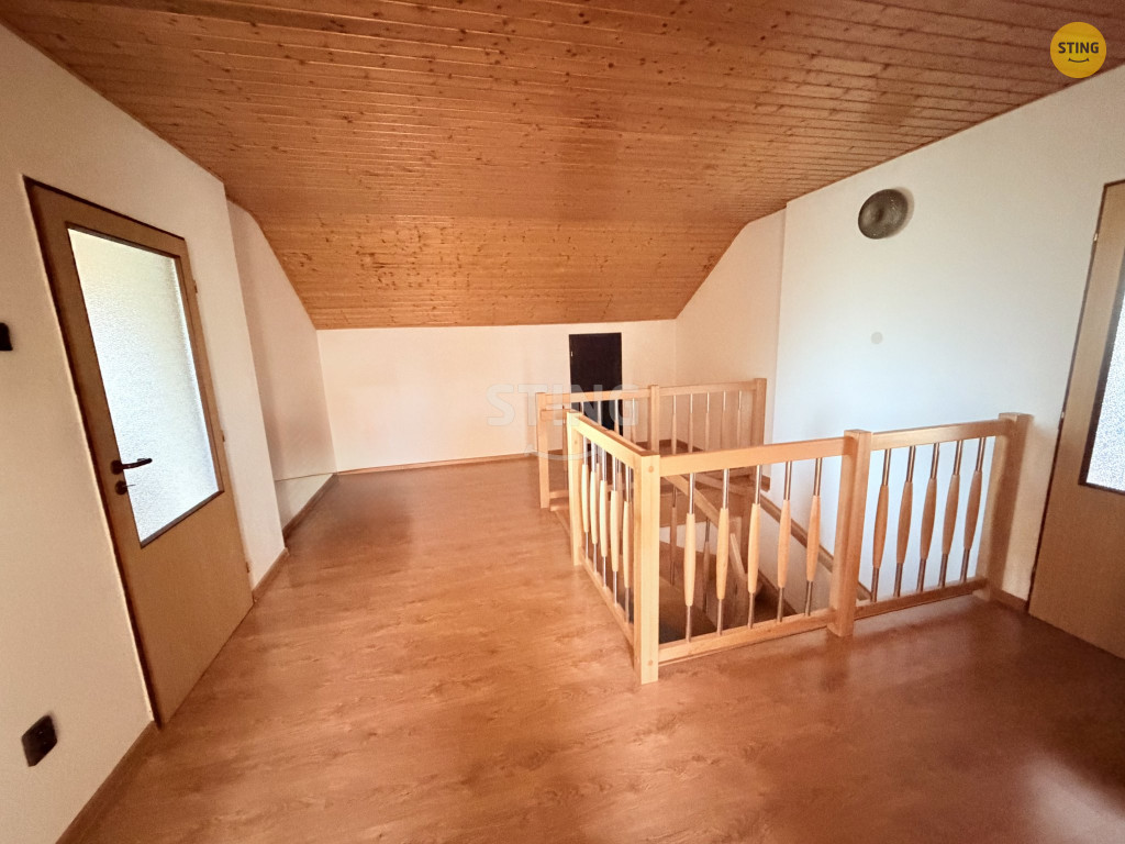 patře je opět prostorná koupelna s WC, chodba, čtyři pokoje z toho dva