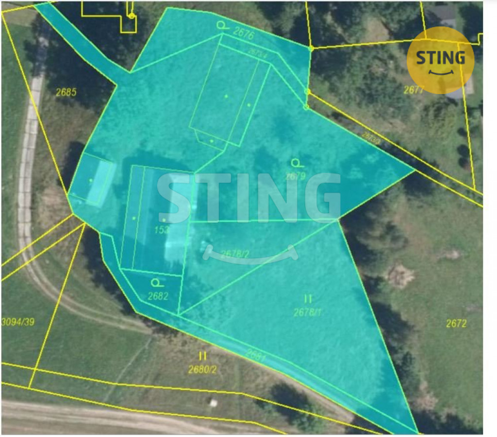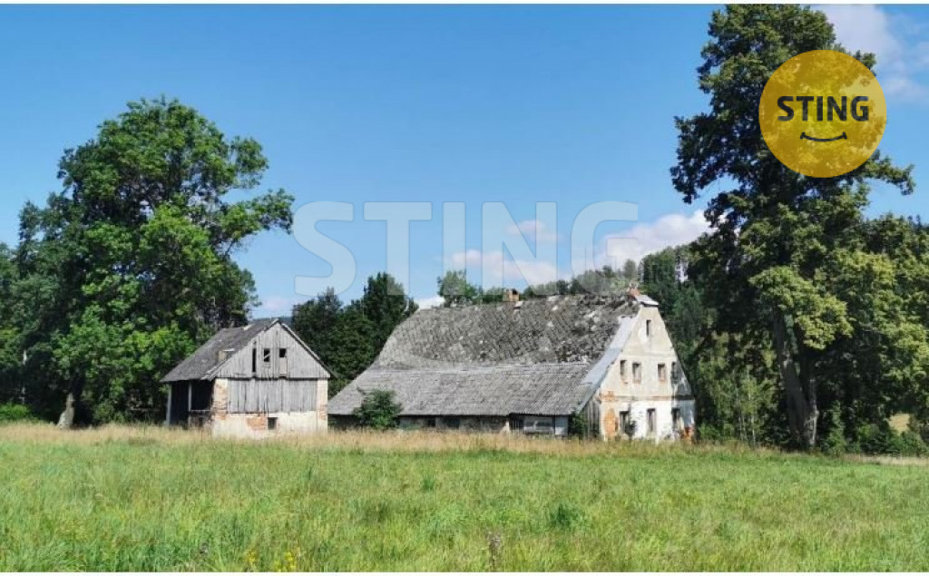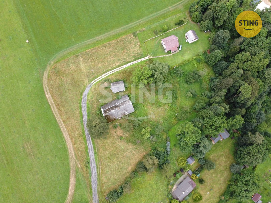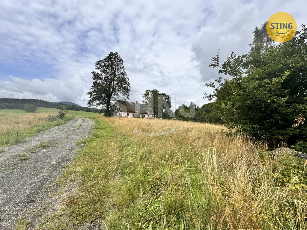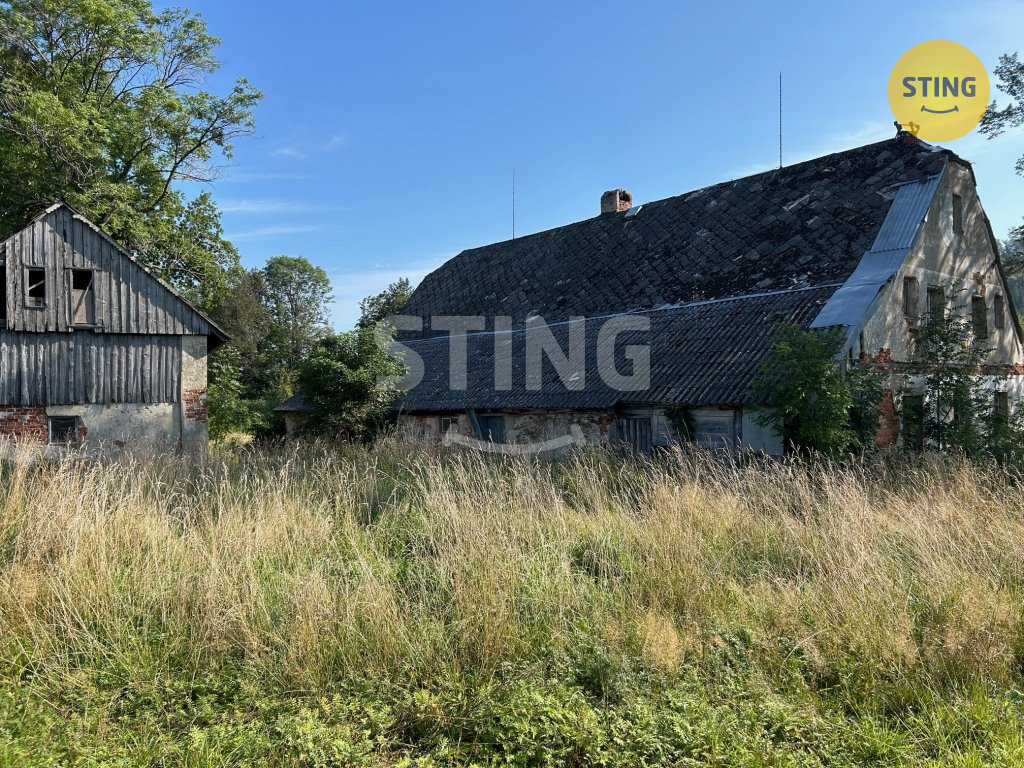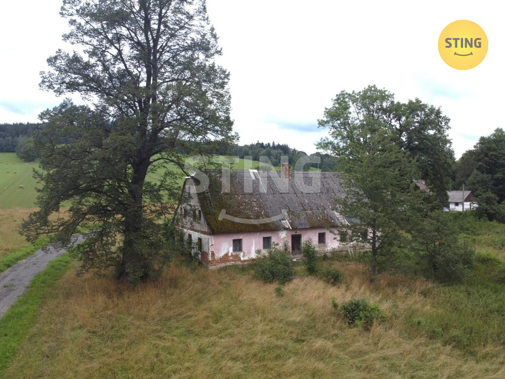 stojí bývalá chalupa se stodolou a vytyčený půdorys o ploše
