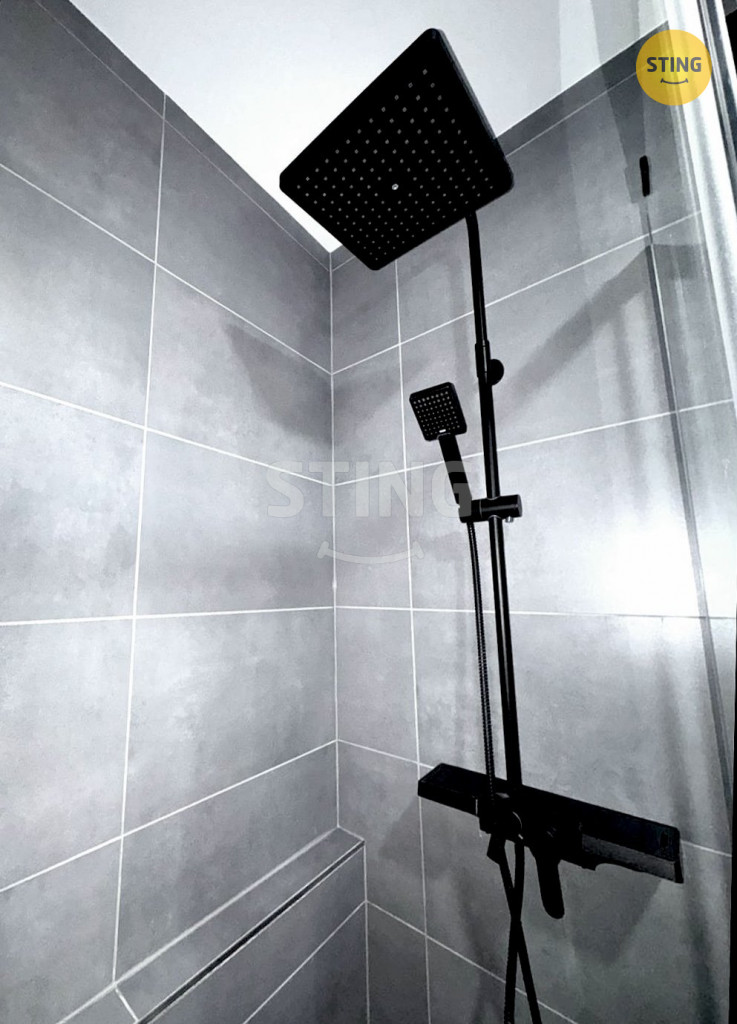 Koupelna je řešena ve stylovém tmavém provedení a nabízí prostorný