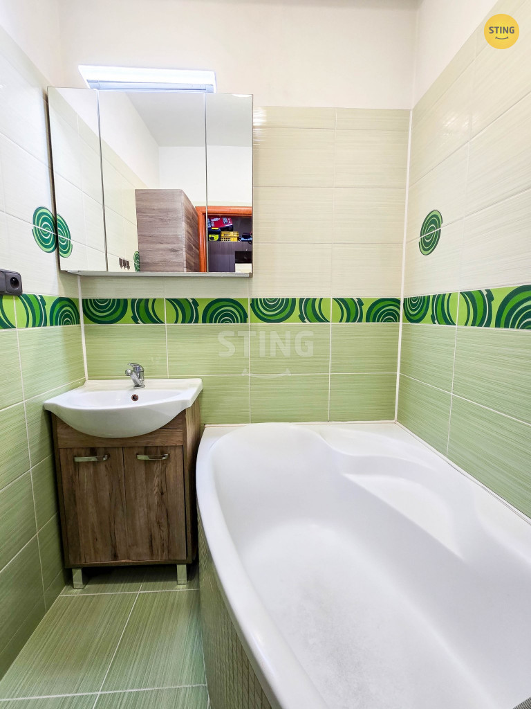 v obkladech a s dlažbou, nachází se zde vana i umyvadlo se skříňkou,