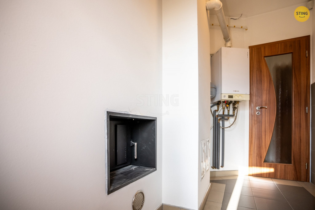 vstupem zvenku a navazující přístřešek pro druhé auto. Vytápění je