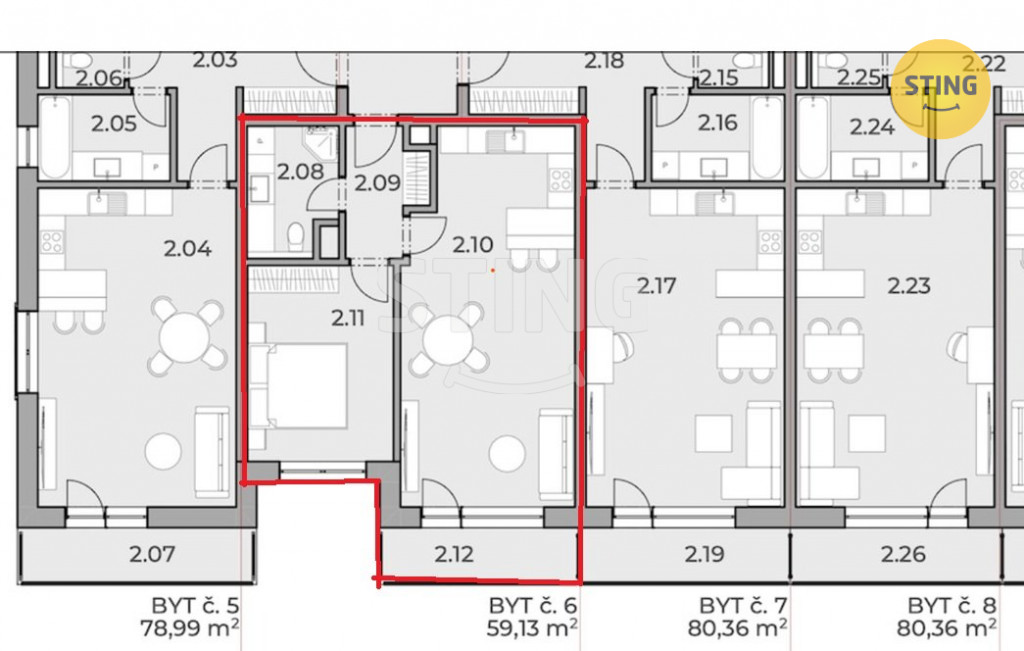 Bytová jednotka zahrnuje zádveří, ložnici, koupelnu se sprchovým koutem,